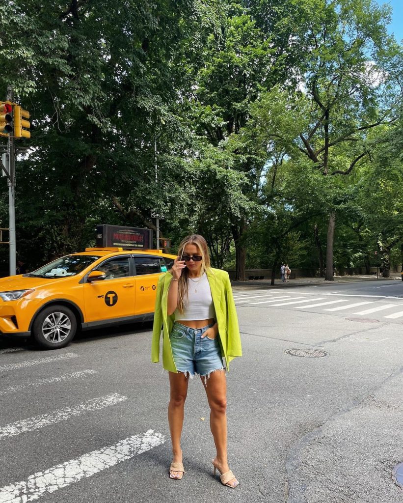 Цей образ — це яскравий варіант літнього вуличного одягу, який поєднує класичні та сучасні елементи. Комплект складається з яскравого неоново-зеленого блейзера поверх простого білого кроп-топа в поєднанні з грубими джинсовими шортами. Це сміливий образ стильного літнього вбрання, який передає невимушену та шикарну атмосферу міської літньої моди.