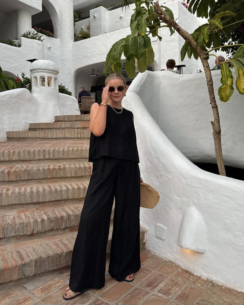 Це вбрання демонструє мінімалістичний, але елегантний підхід до літнього одягу, ідеально підходить для вечірніх заходів або стильного денного відпочинку середземноморського регіону. Повністю чорний ансамбль включає в себе топ без рукавів і широкі штани, які створюють елегантний силует на тлі сільського стилю.