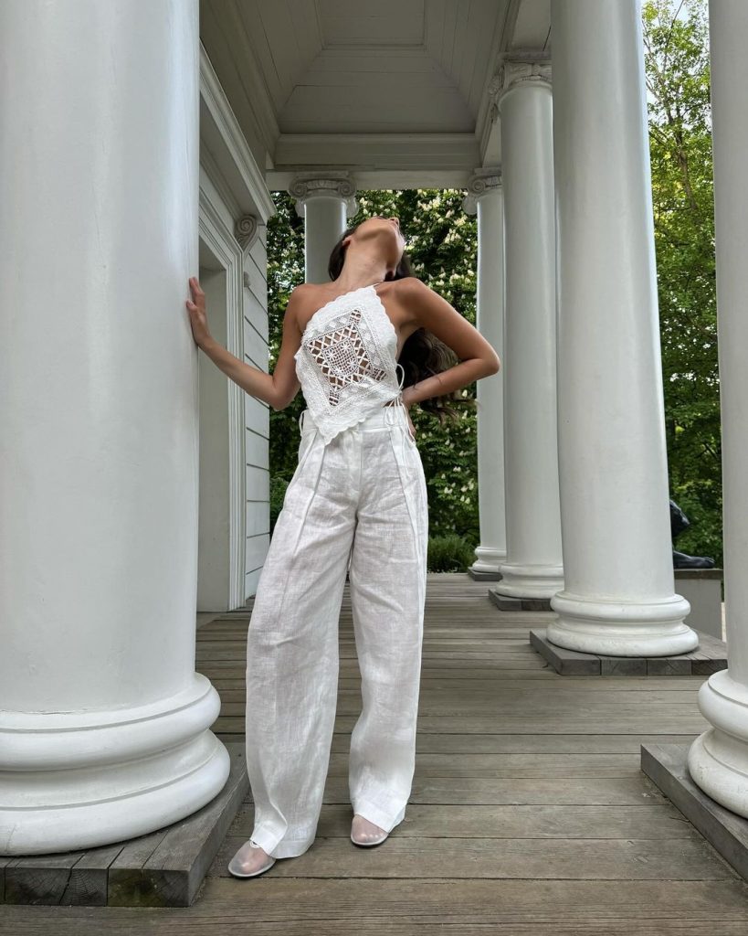 У цьому вбранні вишуканий білий мереживний топ у поєднанні з широкими лляними штанами створює мінімалістичну, але вишукану літню атмосферу. Він ідеально підходить для тих, хто цінує елегантність і комфорт у своєму літньому гардеробі, ідеально підходить для різноманітних випадків від вечірок у саду до елітних бранчів.