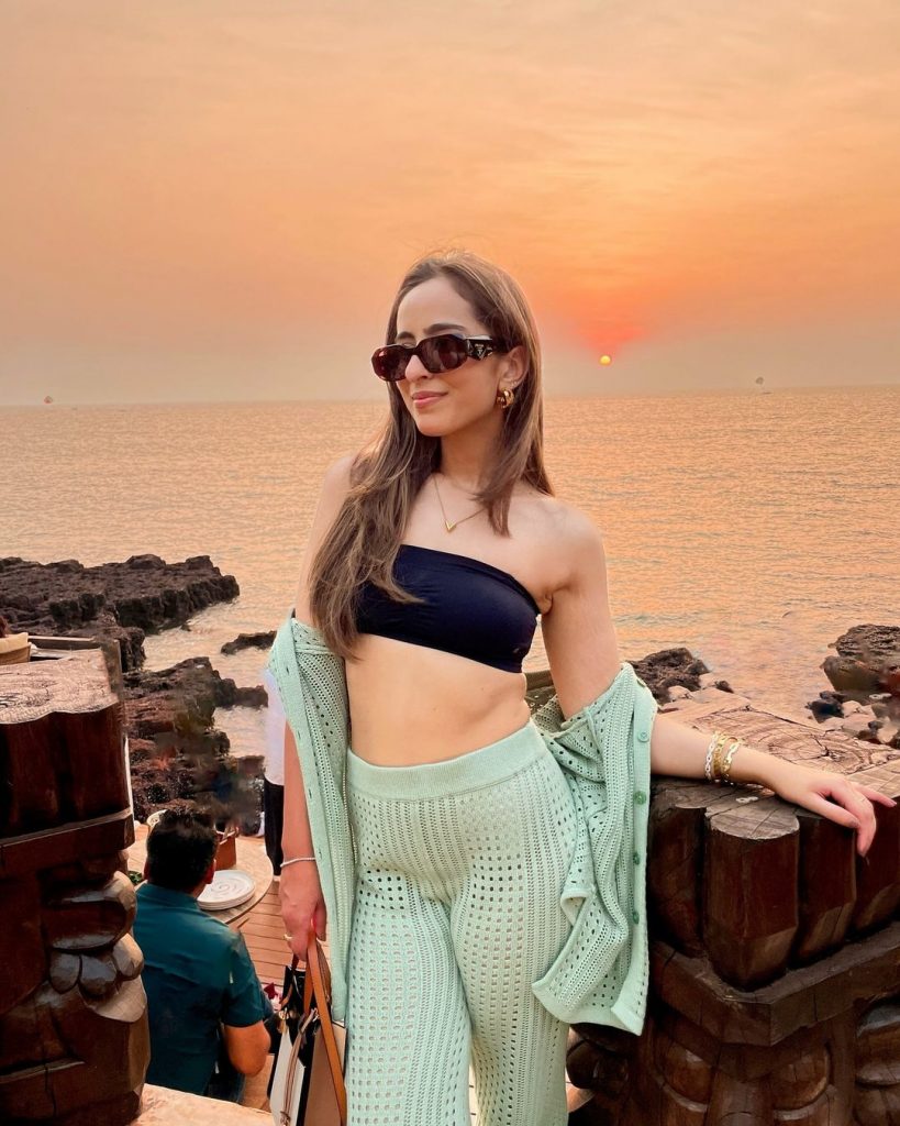 • Аксесуари: золоті браслети та великі сонцезахисні окуляри додають нотку гламуру.